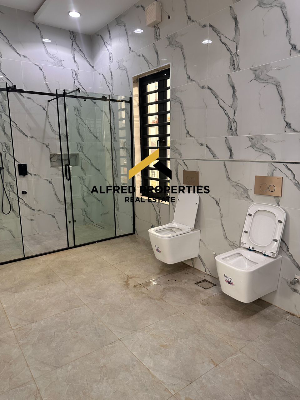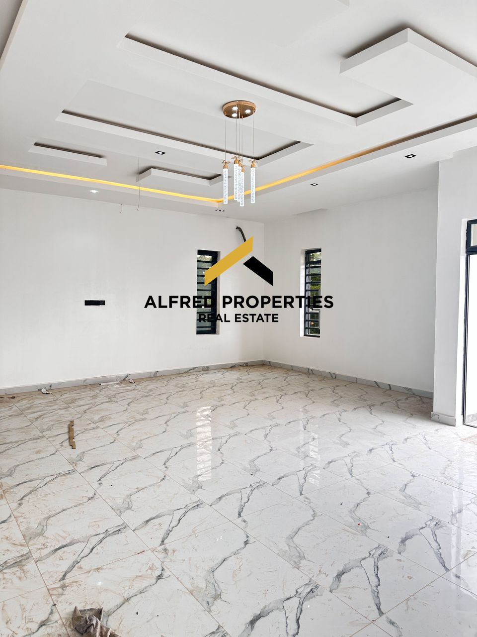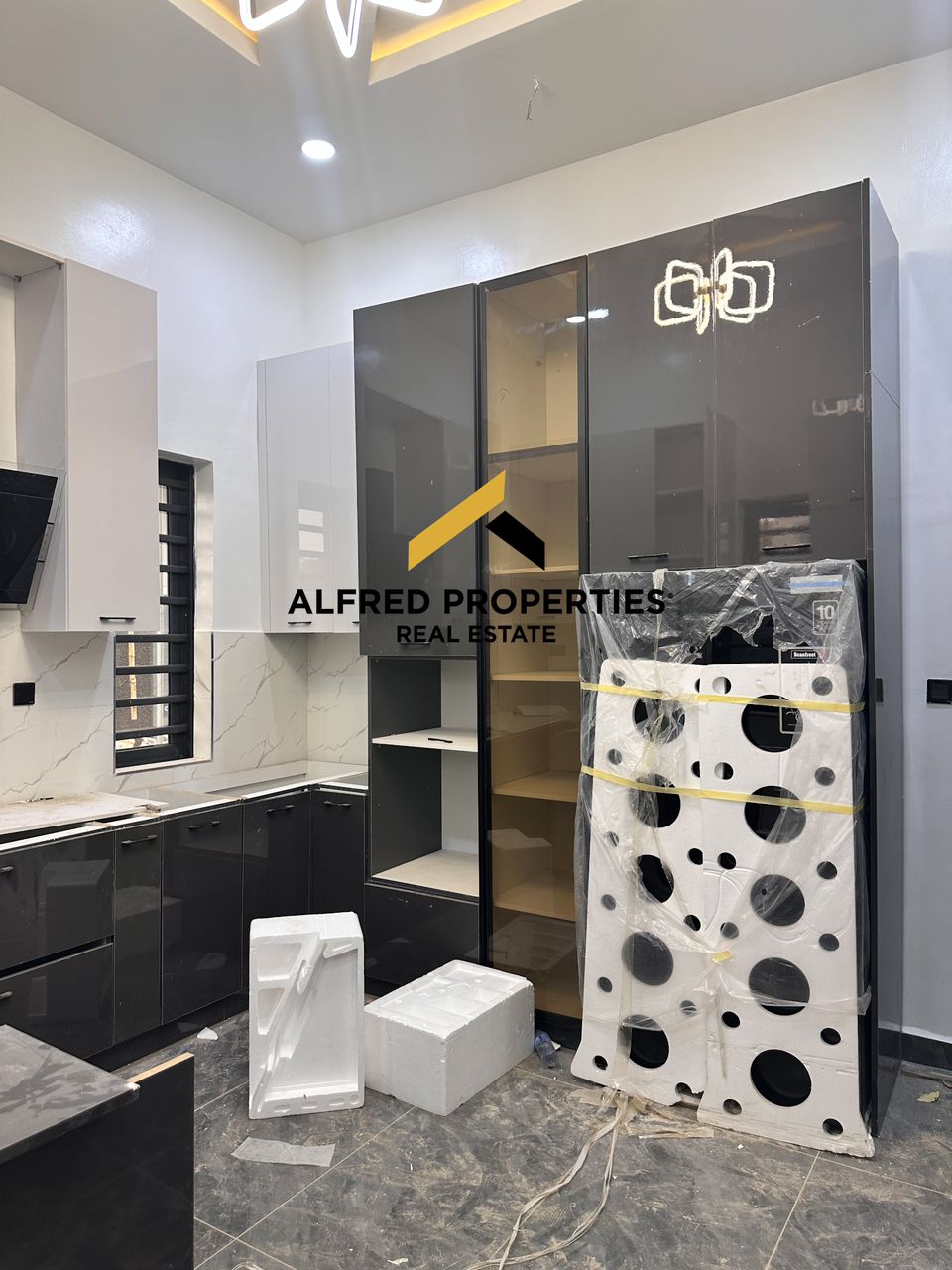 This fully automated 5-bedroom detached smart home with a BQ, smart features, wet kitchens, dry kitchens, all rooms en-suite, a swimming pool, a guest toilet, and an inbuilt speaker.